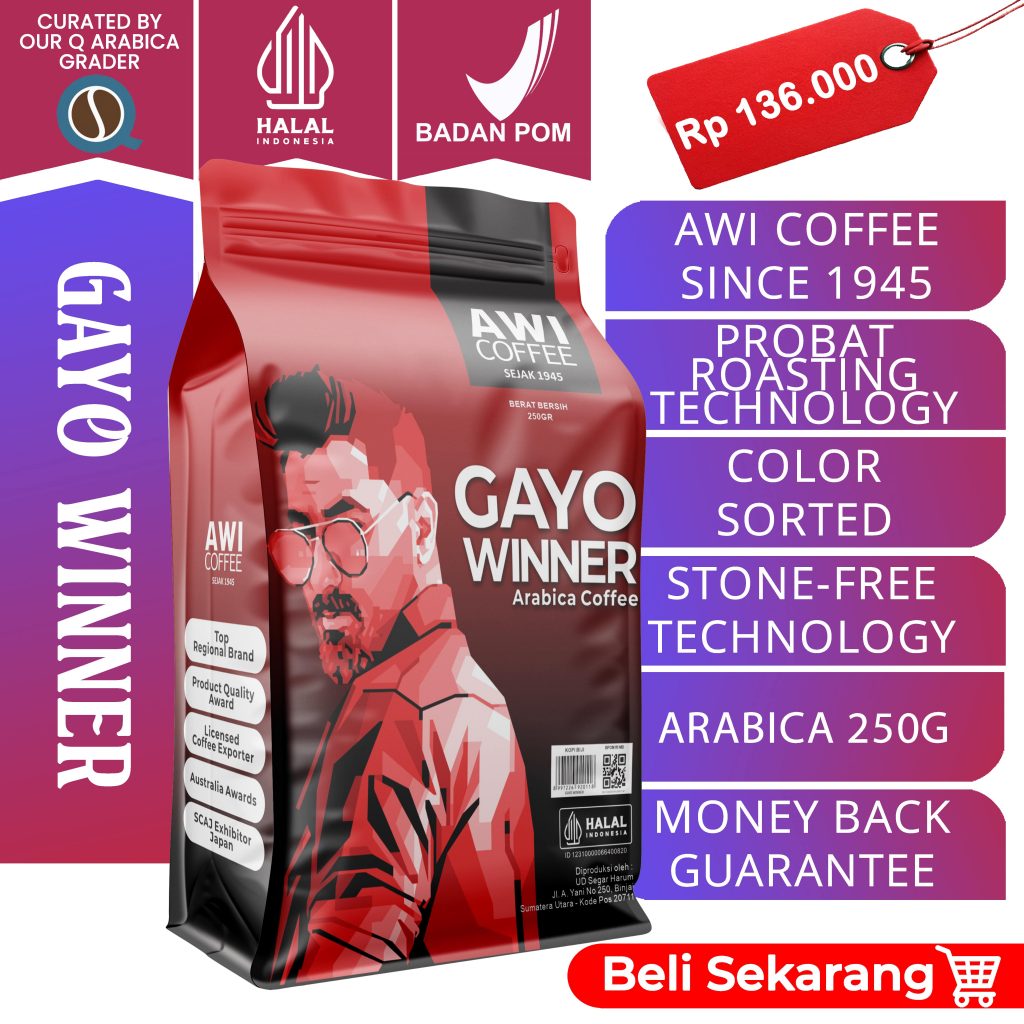 KOPI GAYO WINE adalah trend terbaru dari Kopi Gayo. Masyarakat Aceh menamakan proses pasca panen ini dengan nama “Proses Wine”, yakni melalui proses natural fermentation. Hasilnya adalah kopi arabica yang sangat aromatic, dengan aroma fruity dan wine yang sangat manis dan memikat.Namun jangan kuatir, KOPI GAYO WINE tidak mengandung alkohol. Perlu diketahui bahwa alkohol menguap pada suhu 80 derajat celcius, sedangkan KOPI GAYO WINE disangrai hingga 200 derajat celcius lebih. Kopi GAYO WINE adalah kopi arabica yang berasal dari Jagong Jeget (1560-1680 mdpl), Aceh. Kopi Gayo Wine disangrai menggunakan mesin PROBATONE 12 di Medium City + , dengan cupping notes : Green Apple, Strawberry, Pineapple and Wine, Medium Body & Very Sweet. Nama “WINE” tidak bisa disertifikasi HALAL, namun bahan yang digunakan sudah diapprove oleh MUI. MUI memperbolehkan sertifikasi Halal sebagian produk asal semua bahan sudah disetujui MUI. Versi Halal produk ini akan segera dilaunching dengan nama AWI COFFEE GAYO WINNER.