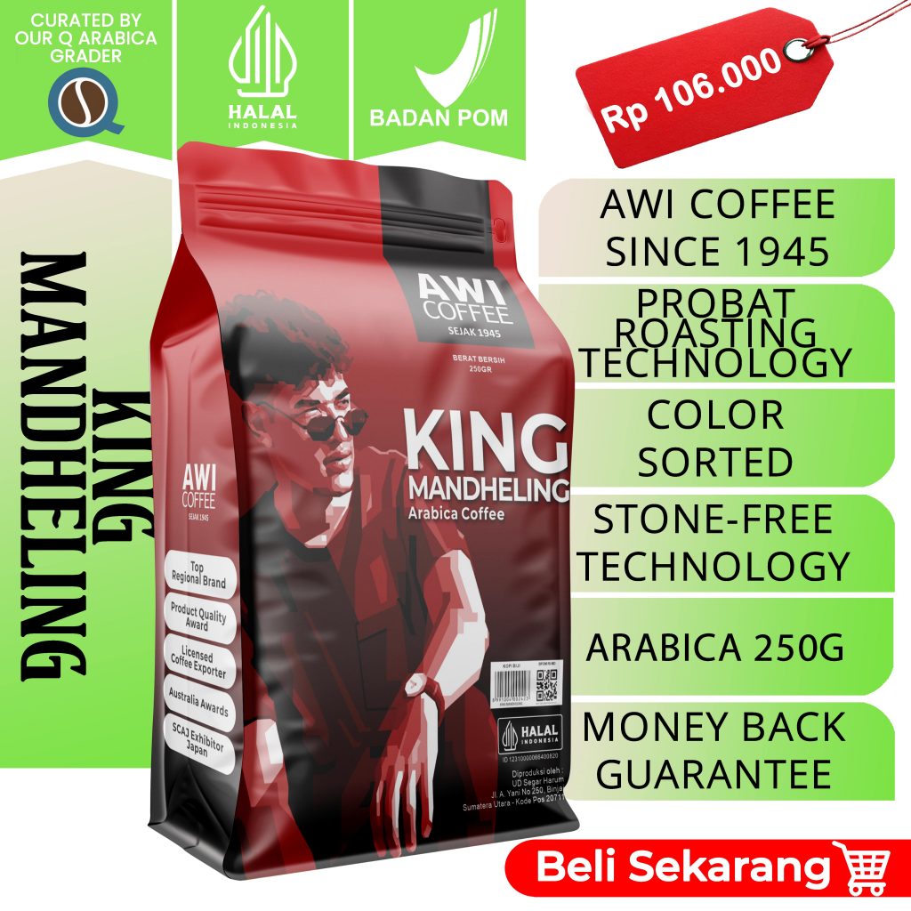 AWI COFFEE KING MANDHELING has a spicy taste, strong chocolate finish. Balance and clean cup, superb sweetness, and good acidity. Medium to bold body. And the most prominent is the long aftertaste of up to 5 minutes. Truly the king of Arabica coffee.