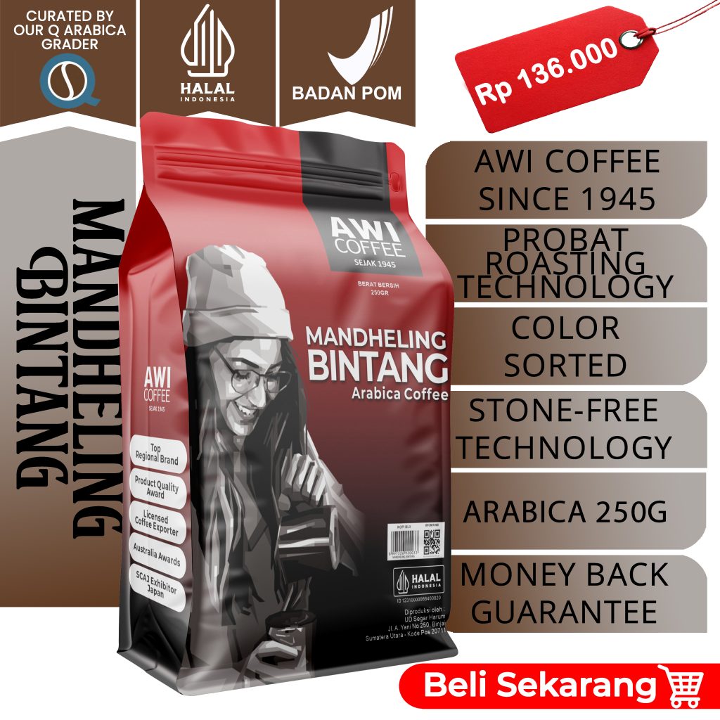 AWI COFFEE MANDHELING BINTANG adalah kopi dari Tanah Karo, Tiga Panah. Proses pasca panen adalah natural process dimana cherry kopi dijemur hingga kering di daerah pegunungan hingga kering 10-11% kadar air sebelum dihulling. AWI COFFEE MANDHELING BINTANG mempunyai fruity wine-beer-like aroma, body yang kuat, serta after taste yang luar biasa.